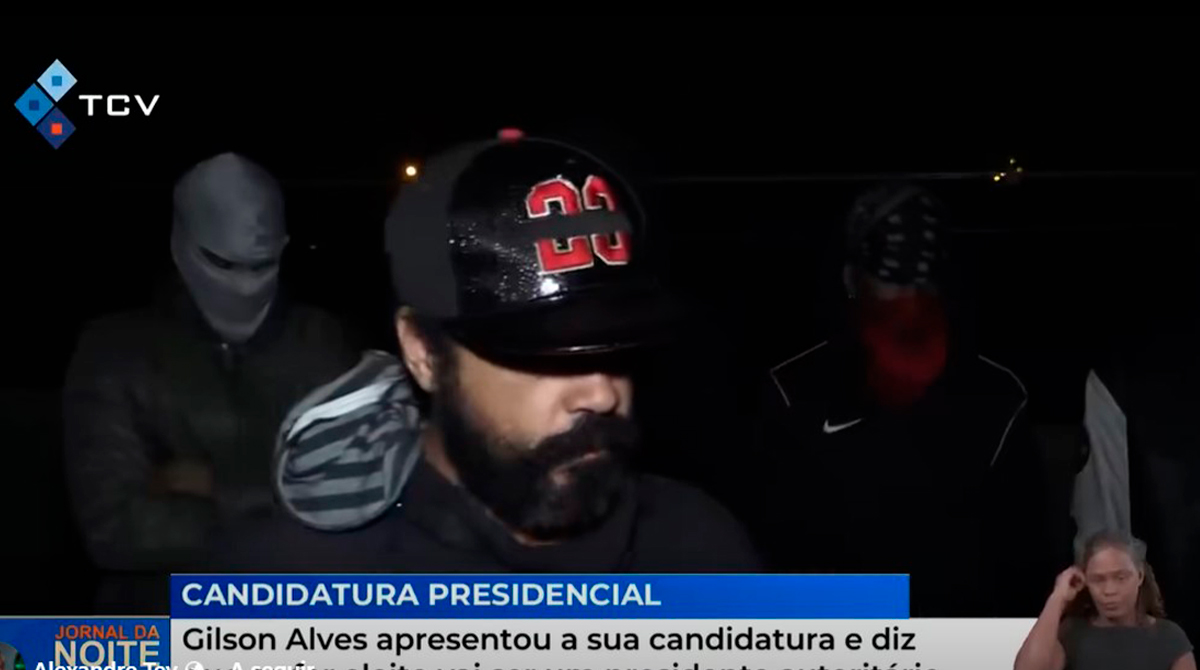 Na notícia divulgada ontem à noite, Gilson Alves aparece com barba rija, trajando um boné que lhe cobre os olhos, acompanhado de quatro indivíduos encapuzados, que, conforme a reportagem da TCV, portavam armas brancas como faca, catana e tubo de metal. Além disso, escolheu falar no terraço de uma casa à noite, num ambiente totalmente escuro.