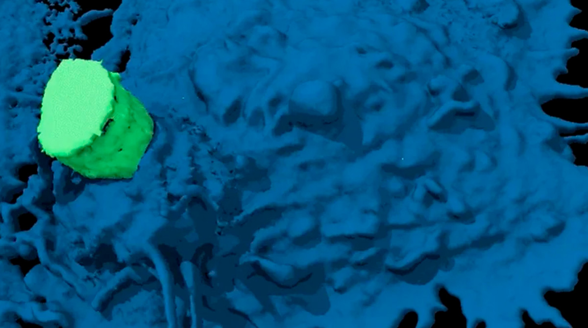 A cena faz parte de um estudo apresentado no fim do ano passado durante a conferência Cell Bio, nos Estados Unidos. O trabalho foi conduzido por pesquisadores da South Dakota Mines e liderado pelo microscopista Brandon Scott, com foco em células de linfoma e leucemia.